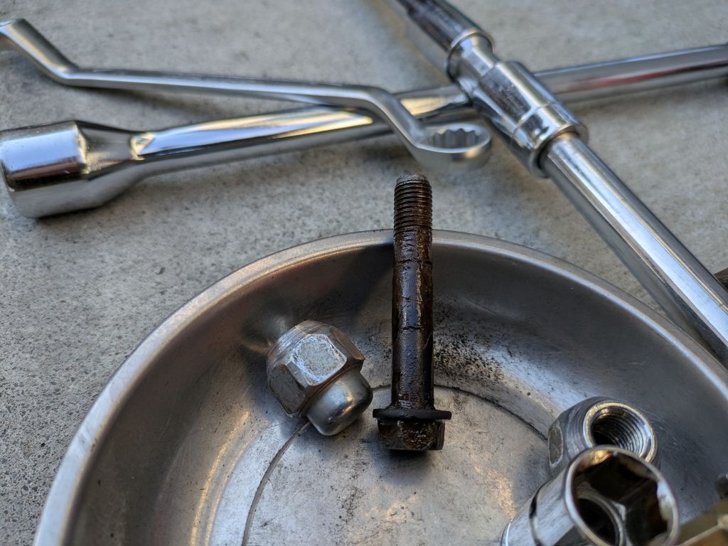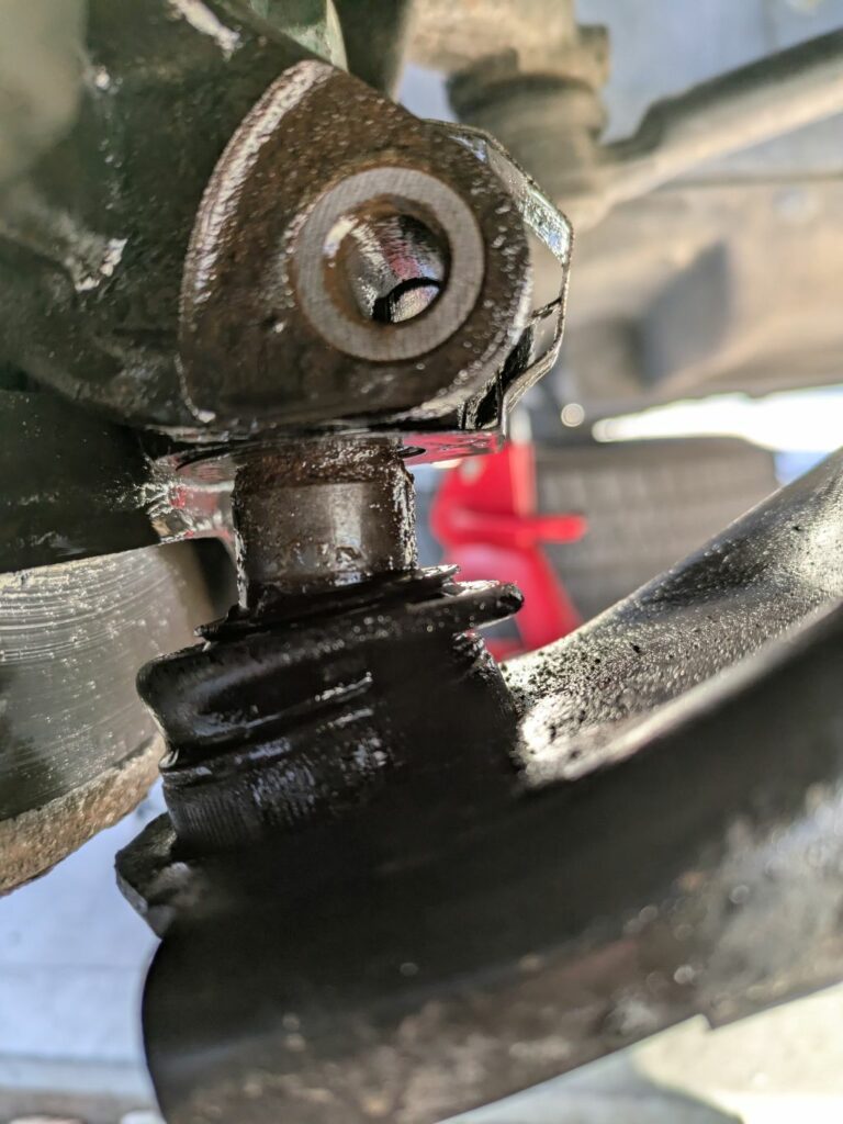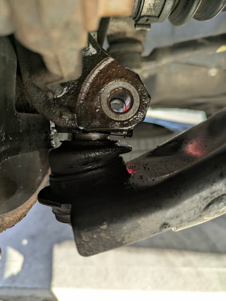 まずはジャッキアップ。タイヤを外して、ロアアームを止めているナットを外します(確か14㎜)。そしてボルトを抜こうとしますがこれが動きません。潤滑剤を吹いて、ナットの頭を右、左と回してから大きめのハンマーで叩くと少し動いてくれます。後は小さめのラチェットのコマなどを使用して叩いて抜きました。