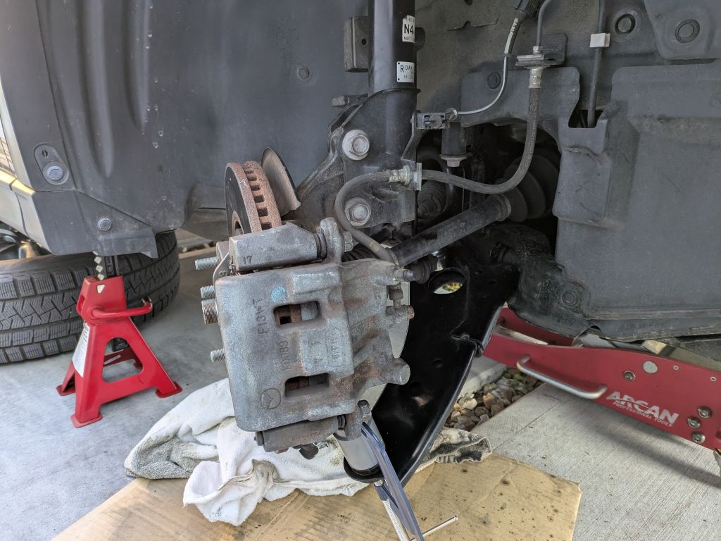 かなり力を込めてゴムハンマーを振ると、少し動いたようです。後は潤滑剤と、ブレーキディスクをパンタグラフ式ジャッキで受けて力が逃げないようにし、ひたすら叩いて抜きました。抜けるとブレーキディスクがガシャッと動くので注意が必要です。