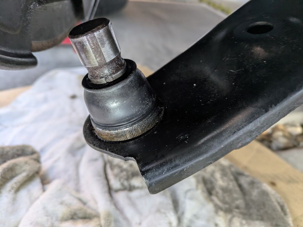 問題なく圧入完了。ボールジョイントを戻すのは、ブレーキディスク側(ナックル?)の穴にボールジョイントの先を入れ、斜めにならないようにしたからジャッキアップして挿入しました。何となくハンマーで叩くのがためらわれたので。挿入が完了したら、抜け防止の14mmボルト・ナットを締めて完了。