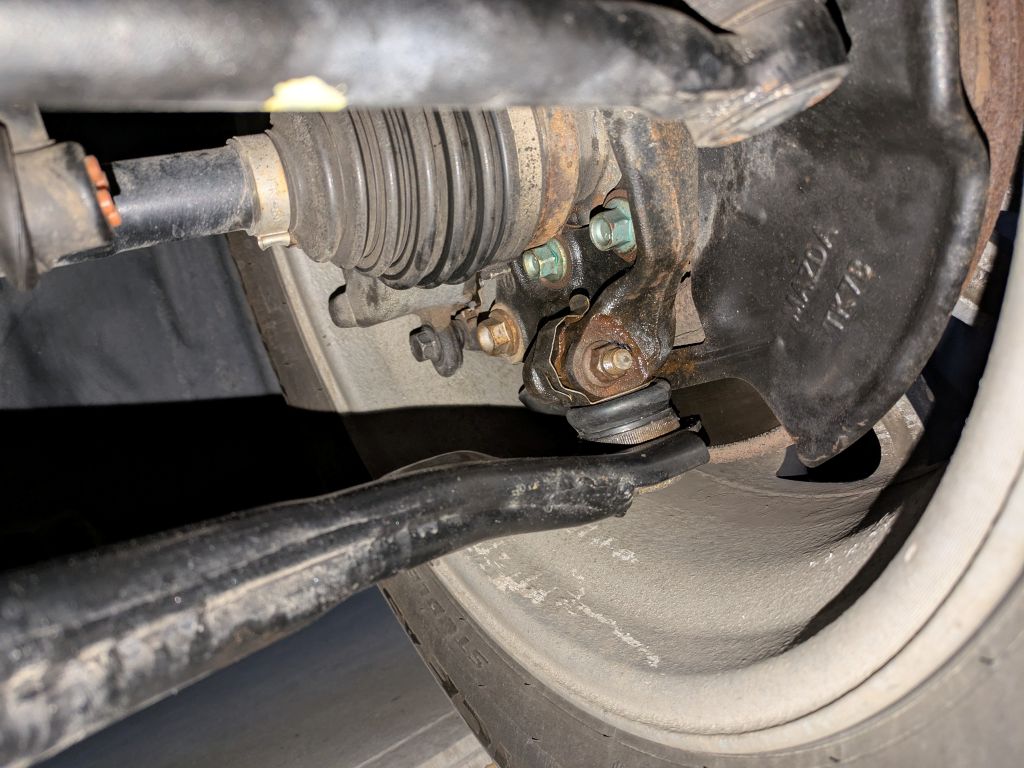交換方法を調べてみると、どうもこの部分のブーツひび割れはマツダ車に頻発しているようです。そして、ディーラーではブーツのみの交換はできず、ロアアーム毎交換になるとの情報が。